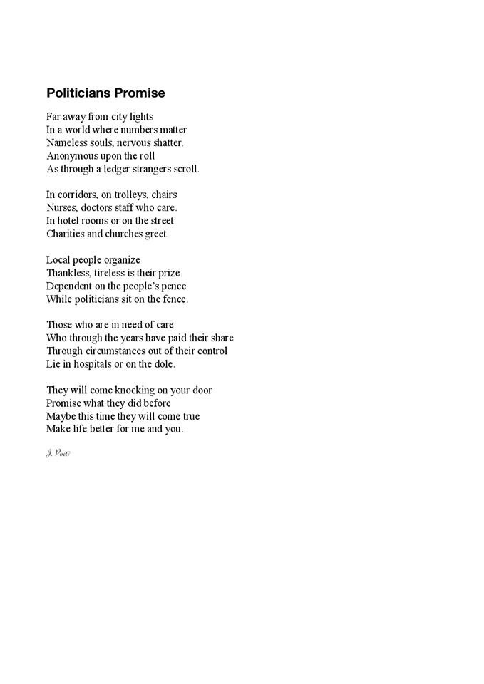 Politicians Promise Share this: Click to share on X (Opens in new window) X Click to share on Facebook (Opens in new window) Facebook Like Loading... Posted on January 9, 2018 Posted in Poetry
