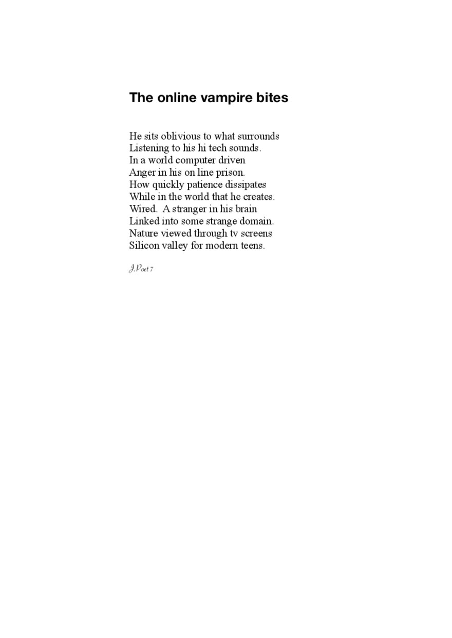 The online vampire bites Share this: Click to share on X (Opens in new window) X Click to share on Facebook (Opens in new window) Facebook Like Loading... Posted on April 7, 2018 Posted in Poetry
